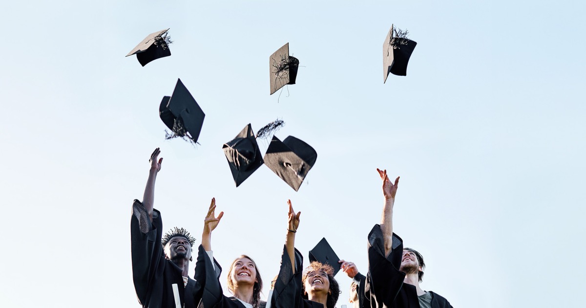 grupo de estudantes recém-formados jogando seu chapéu acadêmico no ar