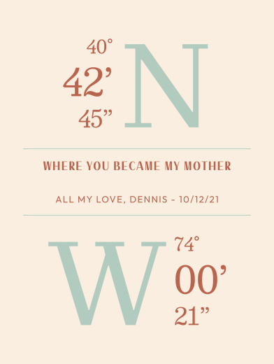 For wall art, your first step is to pick what artwork your mom would like displayed on her walls. If you want to remind her of a special night with a Star Map, simply plug in the location and date and choose what colors and shapes you want to stylize it in. For a Street Map, plug in your location, choose how zoomed in (or zoomed out) you want your map, and again, pick your colors and styles! All of our prints, including our Landmark Posters and Coordinates Posters, are completely customizable, all you need to do is pick the product, choose your desired location, and play around with our design styles until you make it completely your own.
