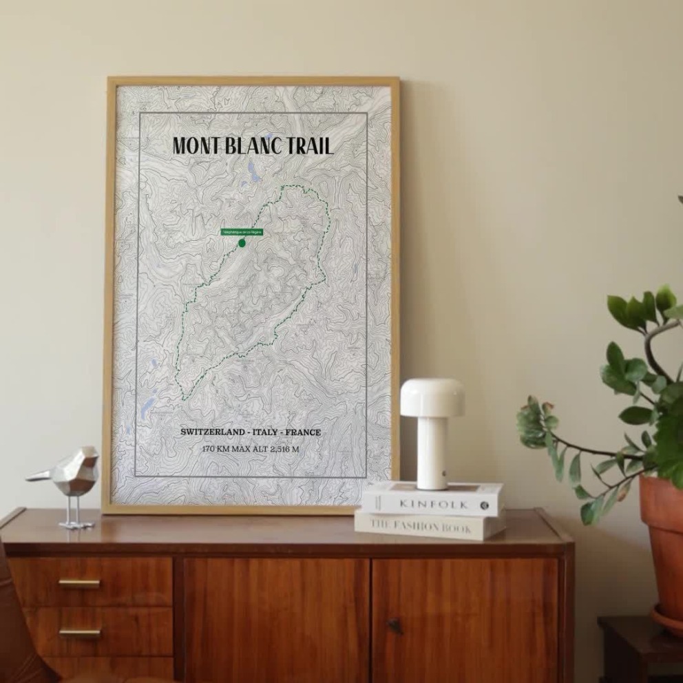 Add a touch of class to your home or office with a Mont Blanc Trail Hiking Trip Poster - Route Map, and transform beautiful artwork into a conversation starter in any space. With a Mont Blanc Trail Hiking Trip Poster - Route Map from our incredible Famous Mountain Hikes collection, you're sure to turn heads. As part of our best-selling line of Topographic Map Posters, this piece is a favorite among Nature enthusiasts and an excellent choice for Gifts for Nature & Outdoor Lovers.
