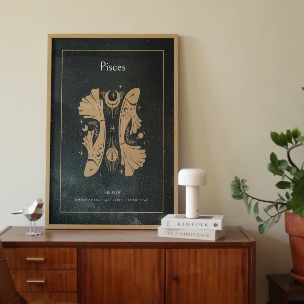 Our Pisces in Block Print - Custom Zodiac Sign Poster is available in the always ideal Portrait orientation, or it can be fully customized to your liking. Perfect for any space, this work comes in various size options and finishing materials. In fact, your Pisces in Block Print - Custom Zodiac Sign Poster will have a classic, gallery-quality look when you choose from Matte Poster, Metal Frame, Canvas, Wood Print, and more. Don't hesitate! Give your walls the makeover they deserve!