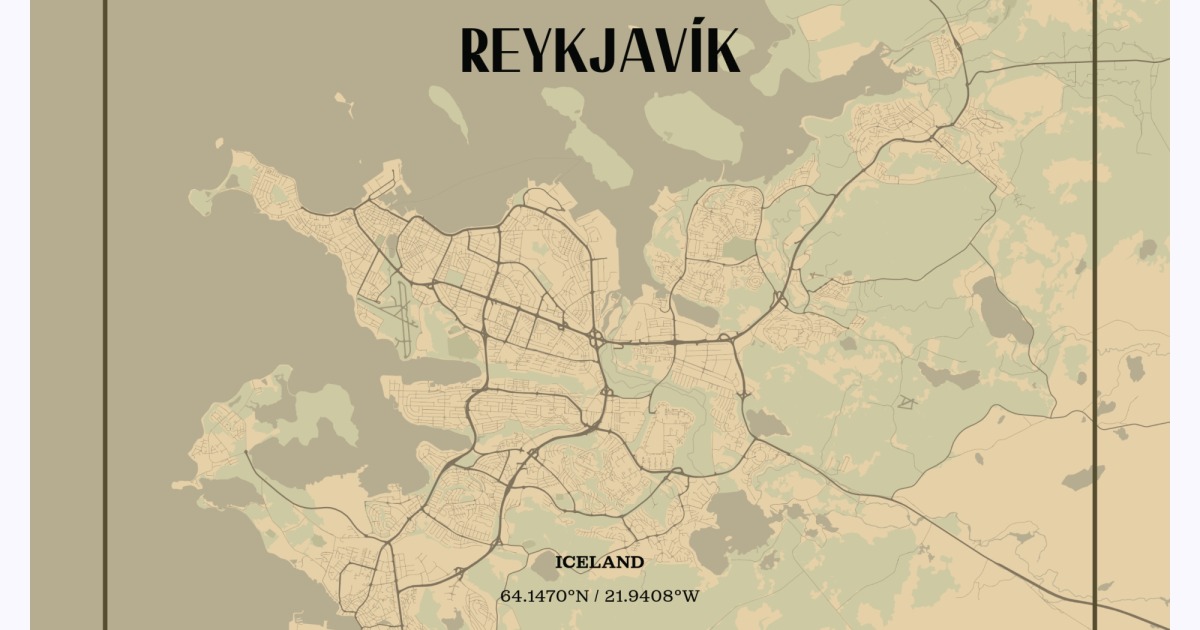 Our Reykjavik in Vintage Poster - Street Map is available in the always ideal Landscape orientation, or it can be fully customized to your liking. Perfect for any space, this work comes in various size options and finishing materials. In fact, your Reykjavik in Vintage Poster - Street Map will have a classic, gallery-quality look when you choose from Matte Poster, Metal Frame, Canvas, Wood Print, and more. Don't hesitate! Give your walls the makeover they deserve!